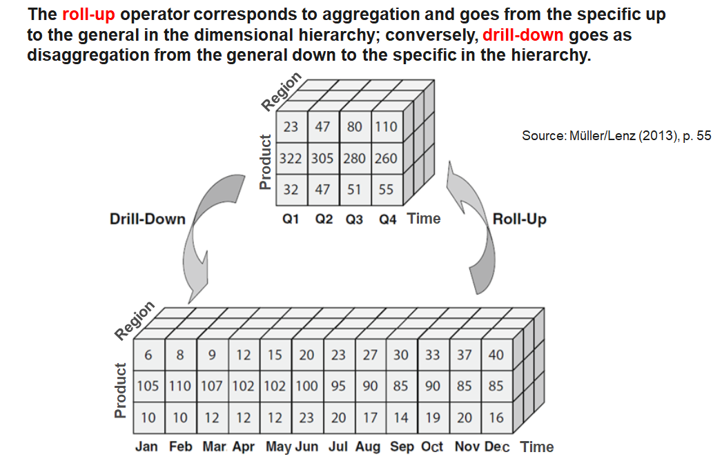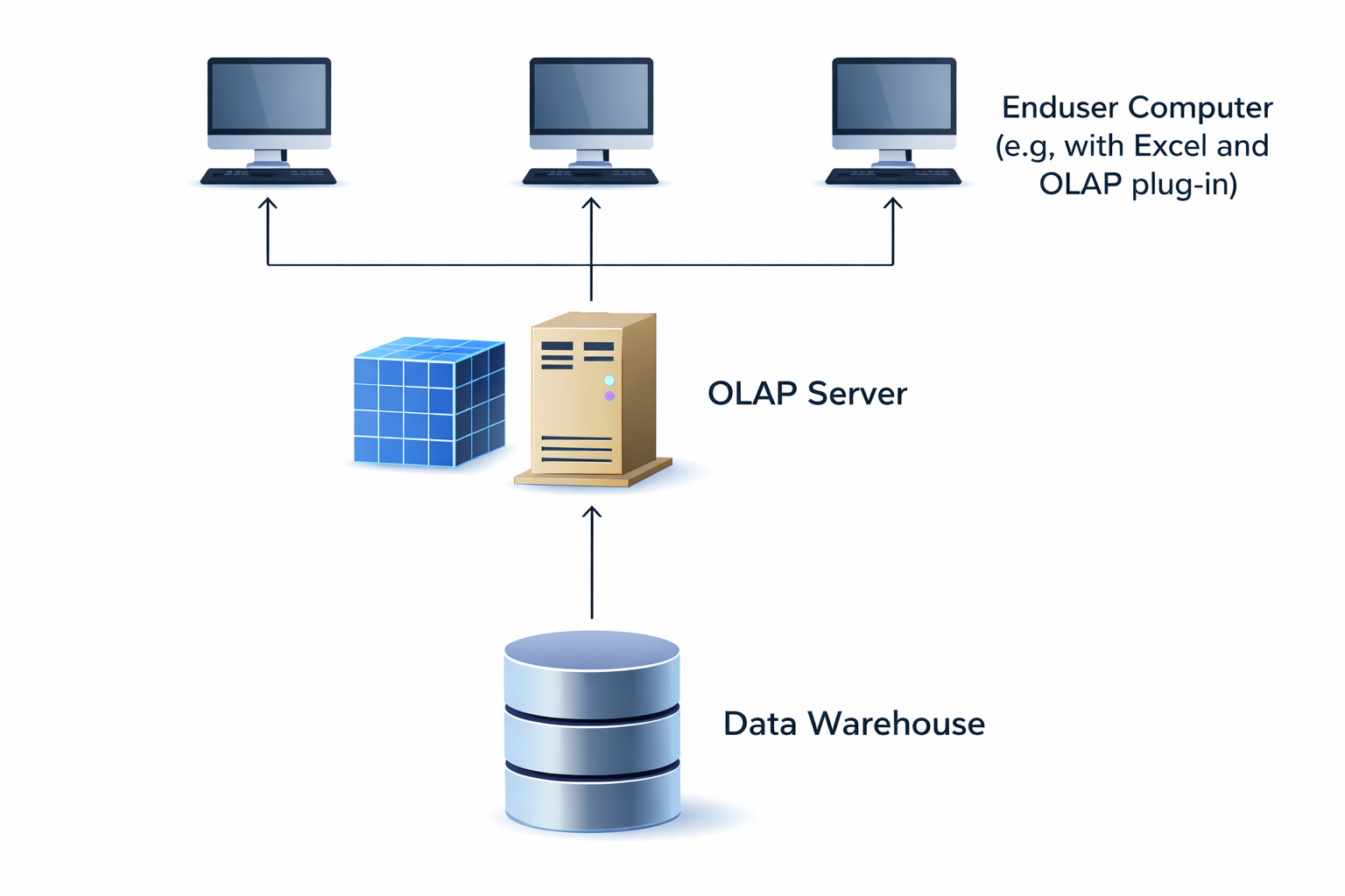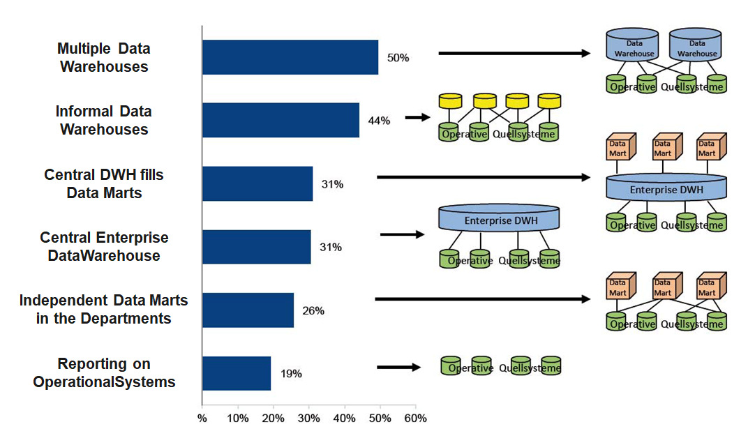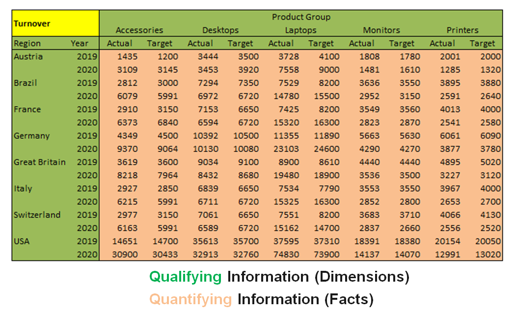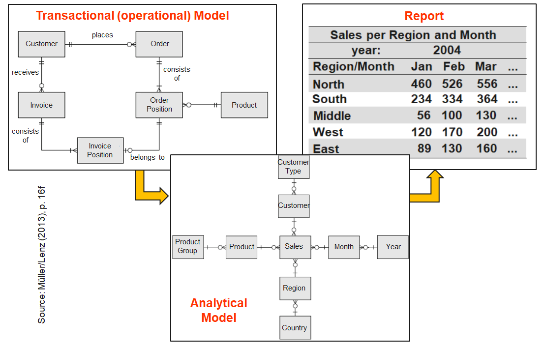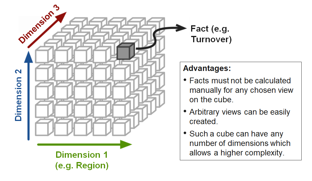 The database represents the core of the data warehouse. It contains current and historical data from all relevant areas of the company. In contrast to the operational databases, the data here is not structured according to the business processes and functions of the company, but is aligned with the facts that determine the company. They are organized in such a way that they can be viewed from different dimensions.