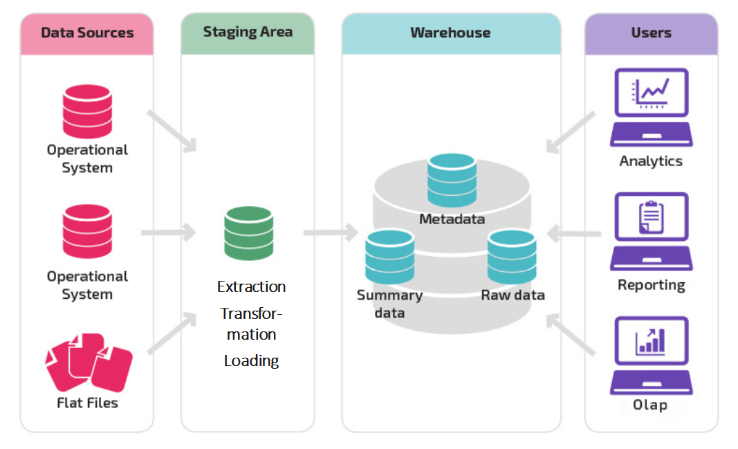 The staging area is a temporary cache that performs the ETL process. It includes the extraction, transformation and loading of the data into the data warehouse.