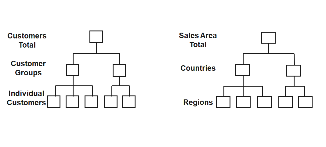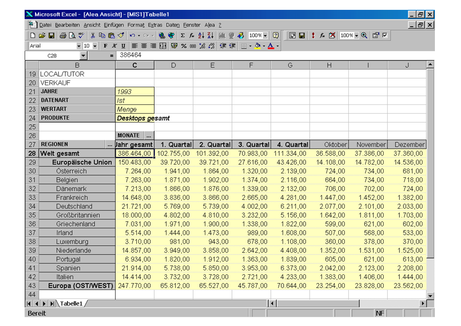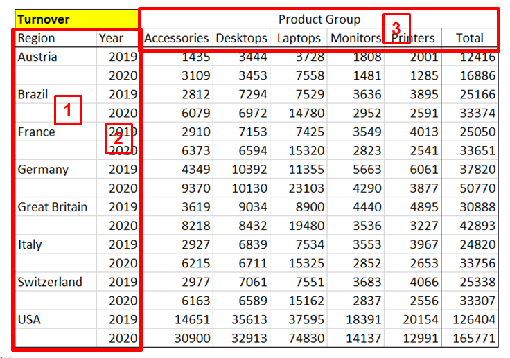 The result of a nest operation physically represents a two-dimensional matrix. It is extended by displaying different hierarchy levels of one or more dimensions on one axis (column or row) in nested form. In the following example, three dimensions are displayed: