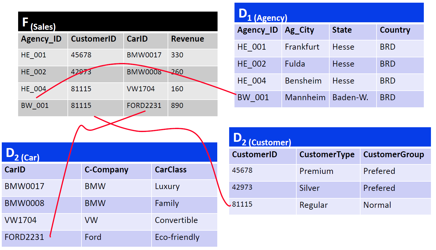 The cardinality between the fact table and a dimension table is n∶1, i.e. a fact (e.g. sales: 67,000 euros) is described by one dimension expression for each dimension (e.g. time: 1st quarter, region: Hesse, product group: books). A dimension characteristic (e.g. product group: books) is associated with 0, 1 or n facts.