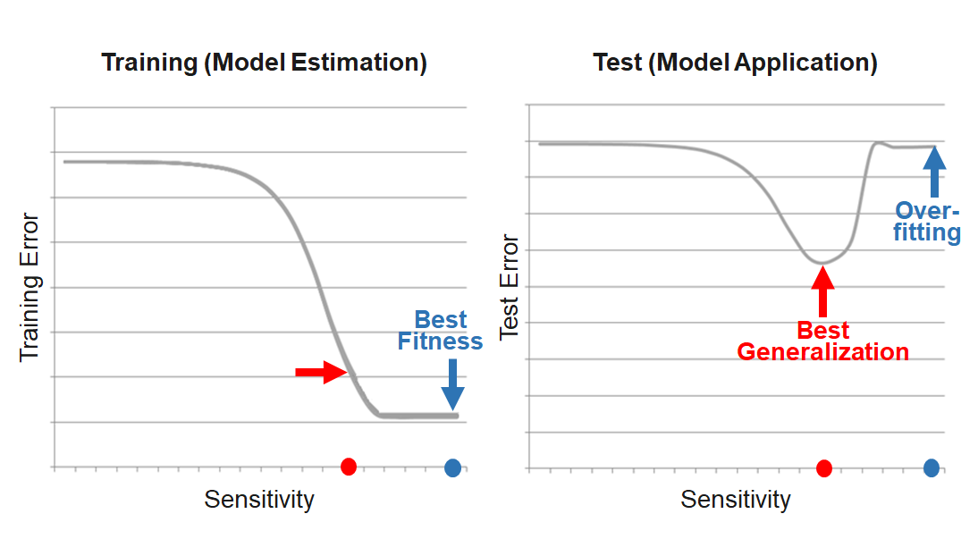 Due to the problem of overfitting, the main goal is to maximize the prediction quality and not to fit the data that is used for the model estimation as well as possible. This is equivalent to minimizing the risk that the model will have weak predictive ability.