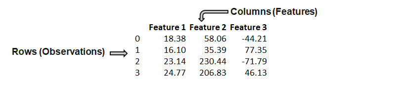 A feature (variable, attribute) is depicted by a column in a dataset. Considering a generic two-dimensional dataset, each observation is depicted by a row and each feature by a column, which will have a specific value for an observation: