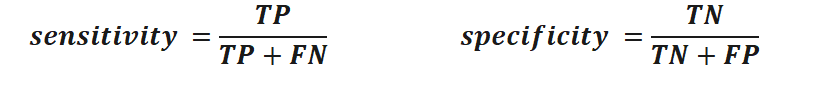 Sensitivity (true positive rate, recall) measures the proportion of positives that are correctly identified as such. Specificity (true negative rate) measures the proportion of negatives that are correctly identified as such.