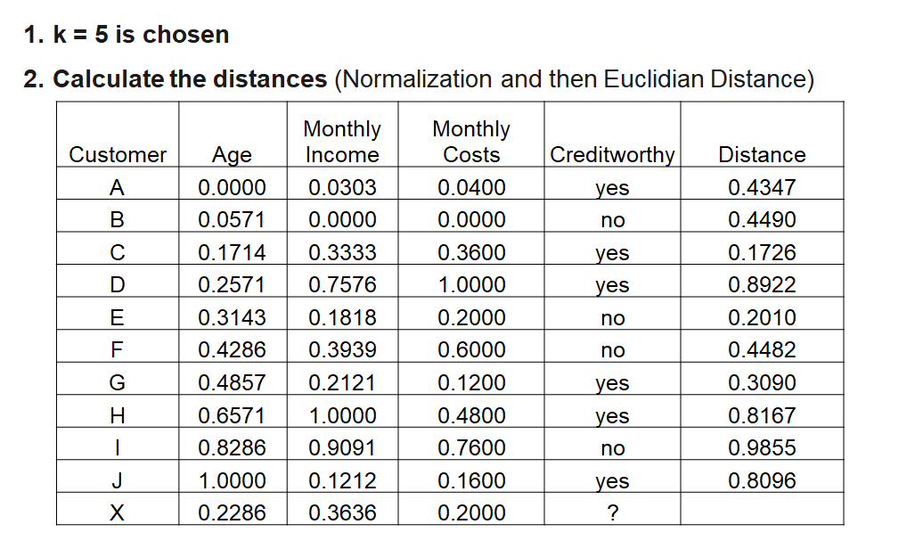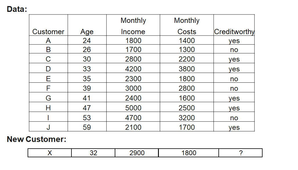 | Customer | Age | Monthly Income | Monthly Costs | Creditworthy | Distance |