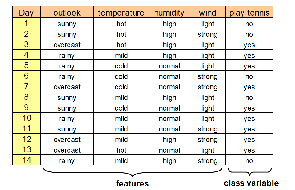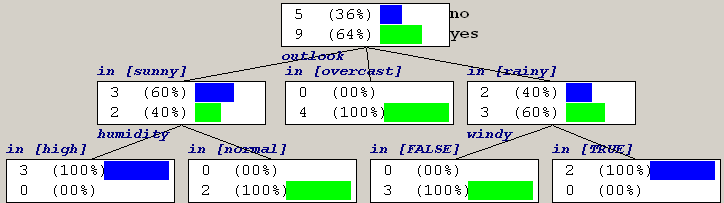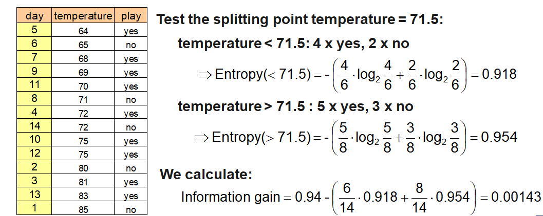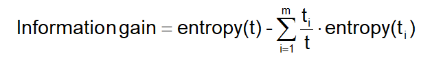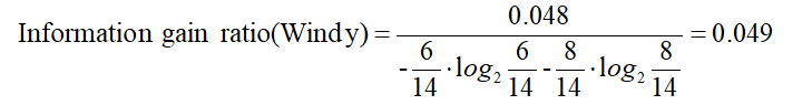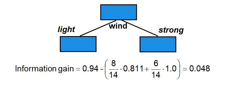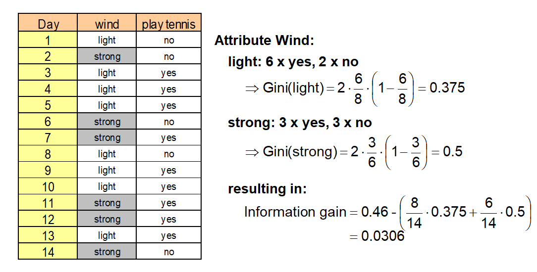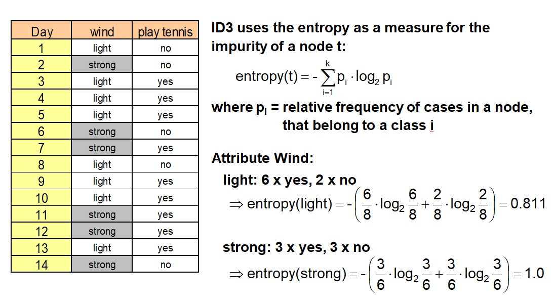 where m = number of values (here two: light, strong), ti = number of data sets with strong or light wind (8 resp. 6), t = total number of data sets (14) and entropy(t) = entropy before splitting.