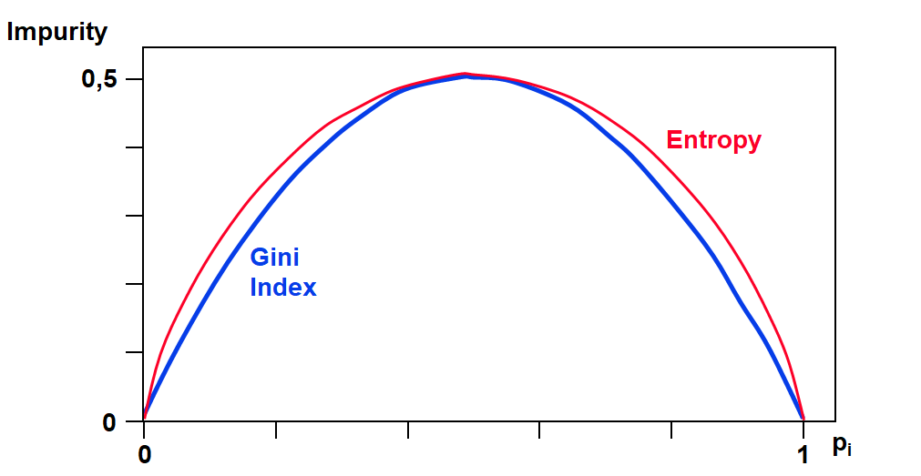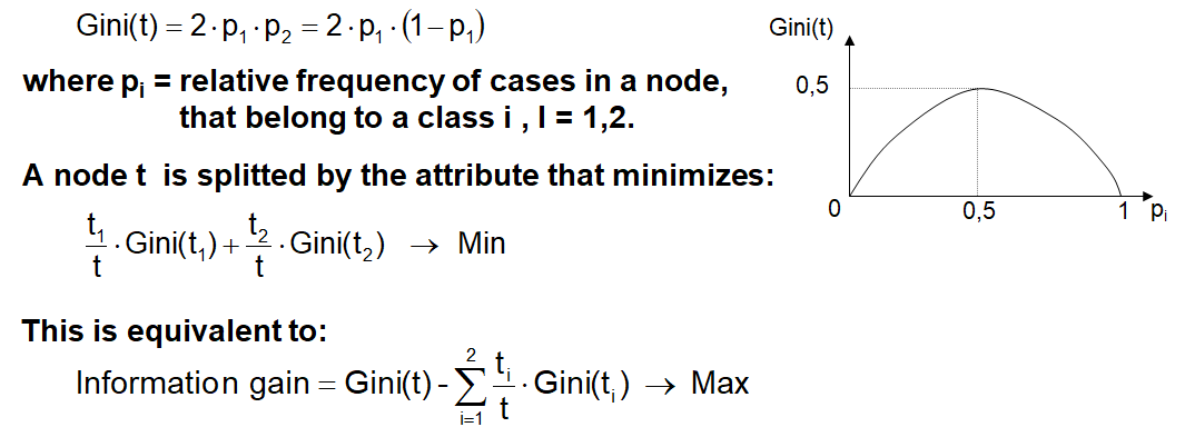 As a measure for the impurity of a node t, CART uses the Gini Index. In the case of two classes the Gini Index is defined as: