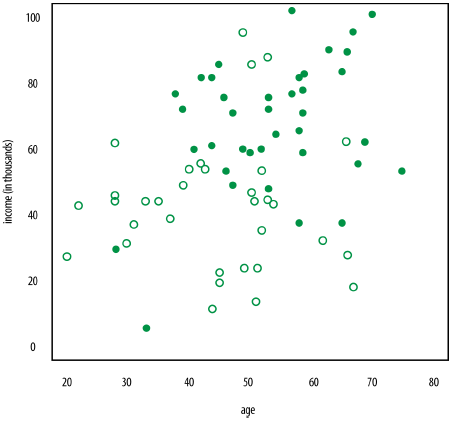 Assume you have the age, income, and a creditworthiness category of “yes” or “no” for a bunch of people and you want to use the age and income to predict the creditworthiness for a new person.