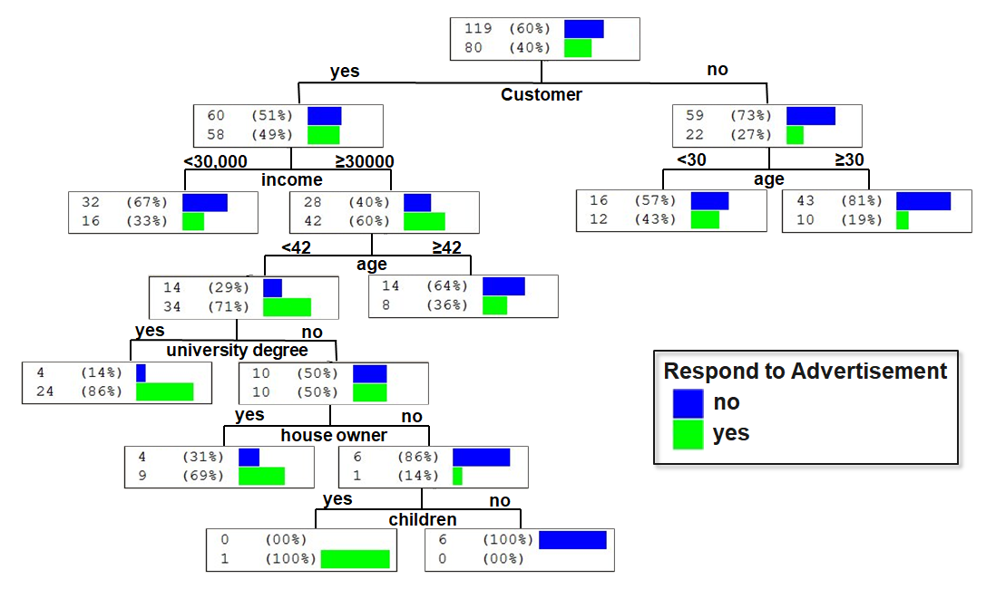 A decision tree consists of nodes and borders. The topmost node (without any parent node) is called “root”. A node without a child node is called “leaf”. Nodes that have parent and child nodes are called “interior nodes”. The interior nodes represent the splitting of the included object sets. An interior node has at least two child nodes (sons). If every interior node has exactly two child nodes, the tree is called a “binary tree”.