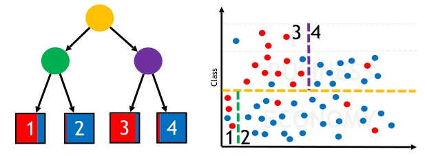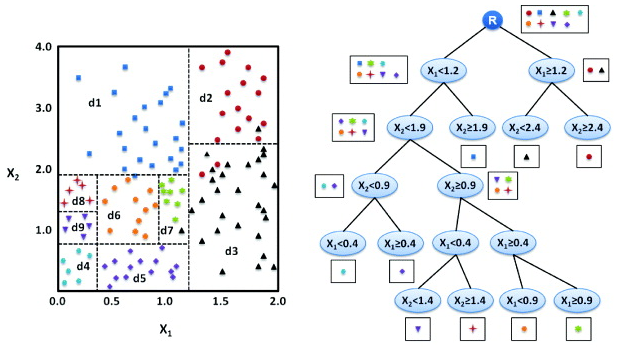 Decision trees belong to the hierarchical methods of classification. They analyze step-by-step (recursive partitioning).