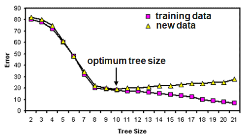 If tree performance is measured from the number of correctly classified cases it is common to find that the training data gives an over-optimistic guide to future performance, i.e. with new data. A tree should exhibit generalization, i.e. work well with data other than those used to generate it. When the tree grows during training it often shows a decrease in generalization. This is because the deeper nodes are fitting noise in the training data not representative over the entire universe from which the training set was sampled. This is called ‘overfitting’.