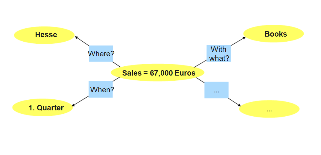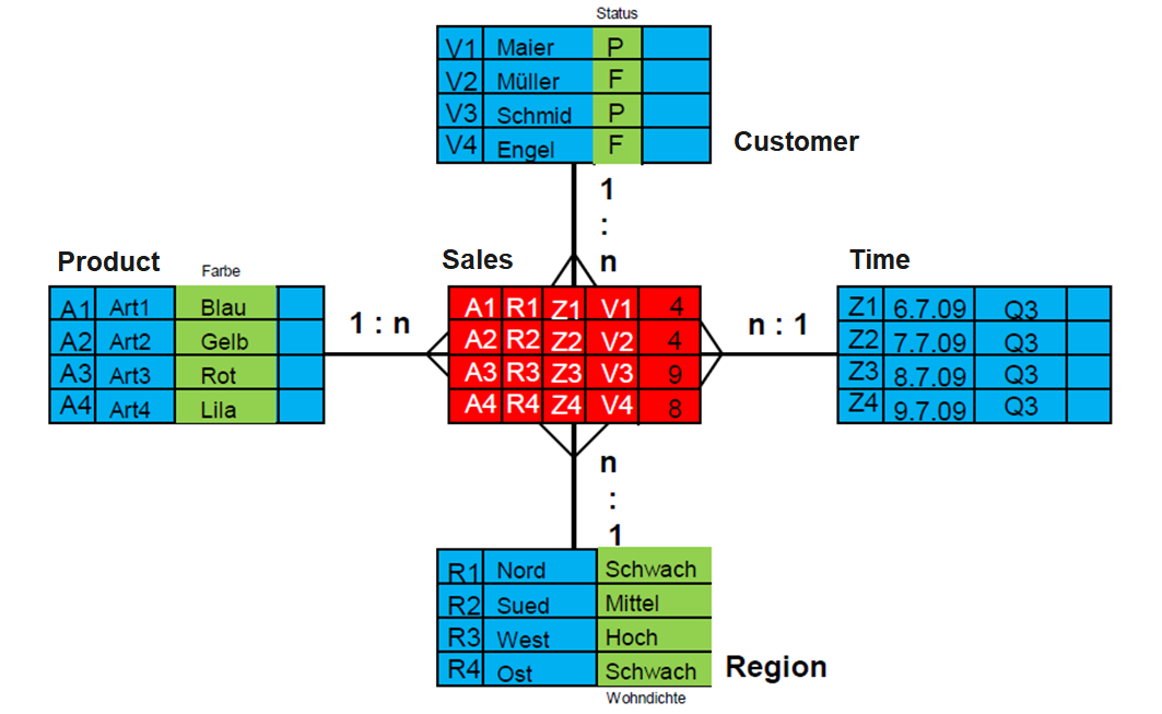 The cardinality between the fact table and a dimension table is n∶1, i.e. a fact (e.g. sales: 67,000 euros) is described by one dimension expression for each dimension (e.g. time: 1st quarter=, region: Hesse, product group: books). A dimension characteristic (e.g. product group: books) is associated with 0, 1 or n facts.