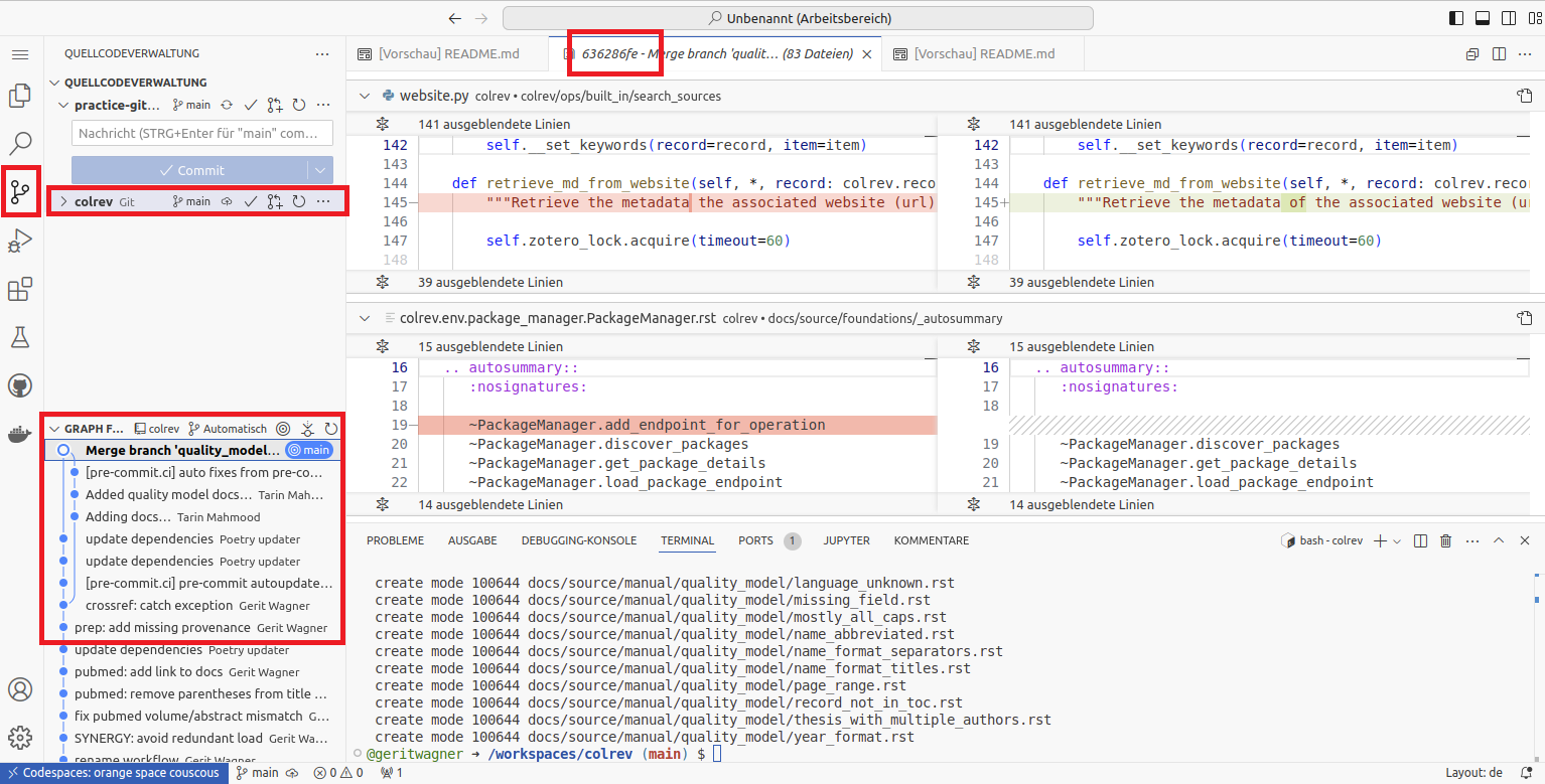 Task: Start GitHub Codespaces from the CoLRev repository and set up the quality_model_docs branch, using the following commands.