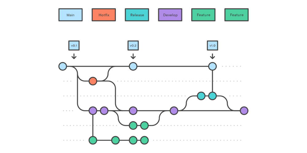 git commit git commit git commit git checkout c1 git checkout-b hotfix git commit git checkout main git merge hotfix git checkout c1 git checkout -b dev git commit git commit git checkout c6 git checkout -b feature git commit git commit git checkout dev git merge feature git checkout main git merge dev