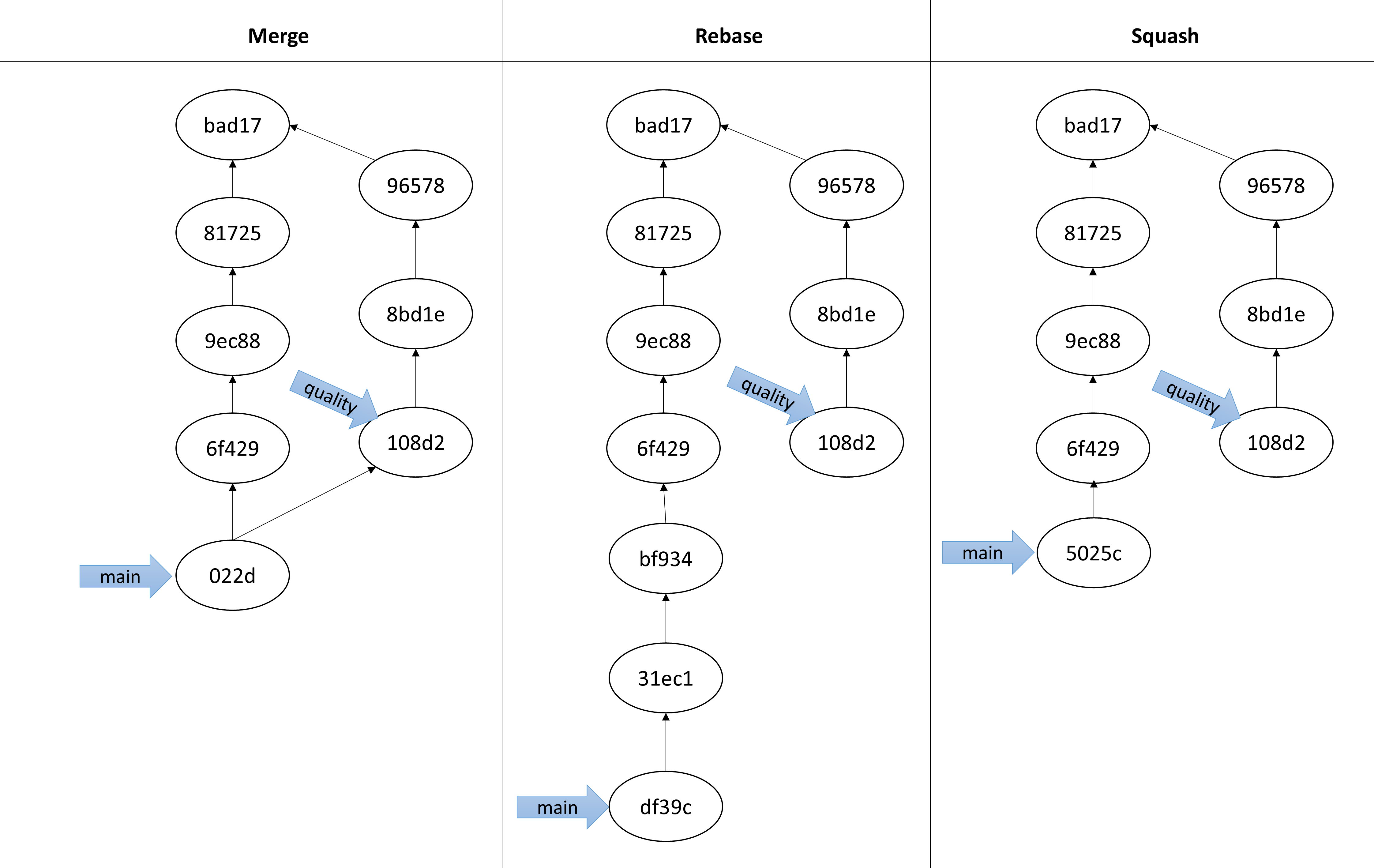 Note: All three methods change the state of the main branch. None changes the state of the quality branch. The commit IDs in your solution will differ.