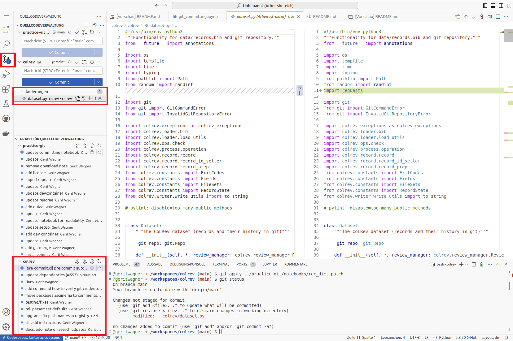 git add -p colrev/dataset.pyTask: Check whether the correct lines were added! Create a commit containing the relevant changes. Afterward, discard the remaining changes.