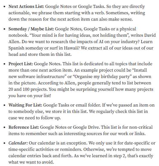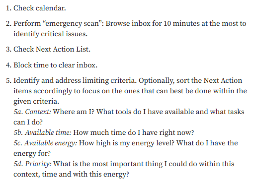 <br> Projects → Areas of focus and acountability → One- to two-year goals and objectives <br> → Three- to five-year vision → Purpose and principles make key decisions on fridays: compare commitments/time available Use checklists/templates for reviews mention: agenda interesting: priority last?     Schritt 1 „Collecting“: Ziel: Nicht soll vergessen werden Alle Dokumente, Notizen, Gedanken, Ideen und to-Dos in einer „Inbox“ ablegen. Es können mehrere „Inboxen“ mit verschiedenen Zwecken. Schritt 2 „Clearing“: Ziel: Ordnung in das Chaos bringen Hier sollen Entscheidungen und Priorisierungen getroffen werden, um alle Dokumente in eine Ordnung zu bringen. Hierfür können mehrere „Inboxen“ angelegt werden, um einen guten Überblick zu bekommen. Für diesen Schritt gibt es noch 2 grundlegende Regeln: 1. 2-Minuten Regel: Wenn eine Aufgabe unter 2 Minuten erledig werden kann, soll dies unmittelbar geschehen 2. Nie etwas zurück in die „Inbox“ legen: Wenn man eine Aufgabe beginnt, sollte man sie unmittelbar erledigen und nicht wieder pausieren Schritt 3 „Organising“: Ziel: Die übrigen Aufgaben werden zugeordnet Nach dem „clearing“ ordnen wir die restlichen Aufgaben verschiedenen Listen mit einem bestimmten Zweck zu. Der Begriff „done“ muss auch für einen selbst definiert werden und wann man Aufgaben von der Liste nehmen kann. Diese Listen können benutzt werden mit den zugehörigen besten Apps dafür: Abbildung 3 Wenn Schritt 2 und 3 öfters wiederholt werden, kann man schneller Aufgaben direkt Listen zuordnen ohne zuerst alles in die gleiche „Inbox“ zu legen Schritt 4 „Refelcting“: Ziel: Immer einen Überblick behalten Wöchentliche Review Sessions sind in diesem Schritt sehr wichtig, diese Sessions sollten immer am gleichen Tag geschehen und am selben Ort (entweder im GTD System oder in einem externen System, das genutzt wird). Diese Review Sessions helfen dir die vergangene Woche zu reflektieren und zu sehen was die kommende Woche ansteht. Hier ist ein Beispiel für eine Wöchentliche Review Checkliste: Abbildung 4 Schritt 5 „Getting Things Done“: Ziel: Aufgaben erledigen Hier werden nun die Aufgaben zur richtigen Zeit am richtigen Ort erledigt. Für diesen Schritt sind Daily Reviews am Anfang des Tages sehr nützlich, um die Aufgaben möglichst effizient zu erledigen. Beispiel für eine tägliche review Checkliste: Abbildung 5 Für den Review täglich oder wöchentlich sollte mindestens 60-90 Minuten eingeplant werden 1.2 Getting Things Done: The Science behind Stress-Free Productivity (Quelle Science Direct) - GTD ist simpel und felxibel um Aufgaben und AKtivitäten zu organisieren - hilft die persönliche Produktivität zu maximieren - hilft dabei nichts zu vergessen, was man im Kopf hat, da man es sofort dokumentiert - Gleiche Schritte und Beschreibung, wie bei 1.1 nur anderee Abbildung