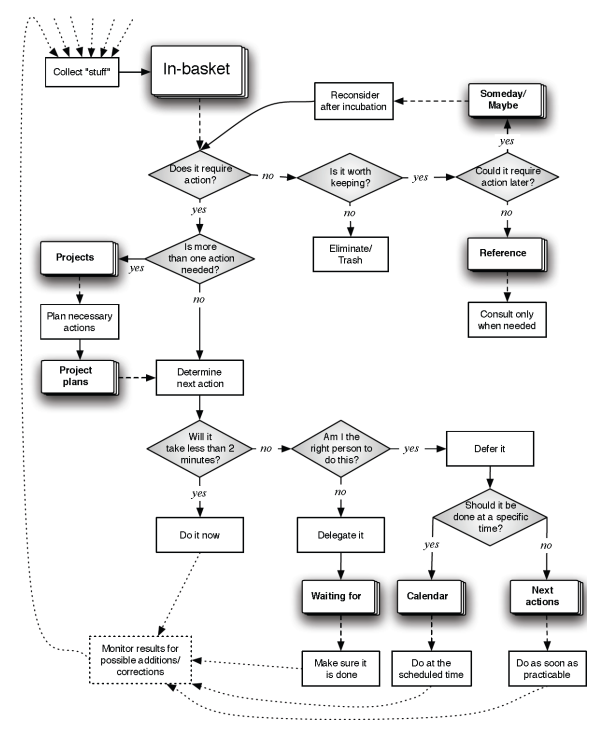 process model... Different lists/elements of the system Lists: - next-actions: office, calls, agendas - someday-maybe - projects - waiting-for (email: self-cc) - reference material - calendar -> How would you organize those lists in your systems/digitally?